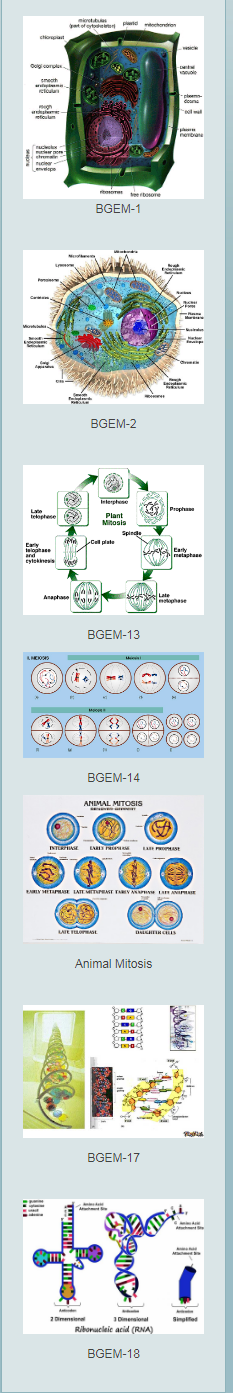 | BGEM13 | Mitosis set of 10 model- It consists of the following stages : (1) resting cell (2) Prophase (3) late Prophase (4) Metaphase (5) Anaphase (6) Late Anaphase (7) Telophase (8) Late Telophase (9) Daughter cell (10) A detailed cell | 1625 |