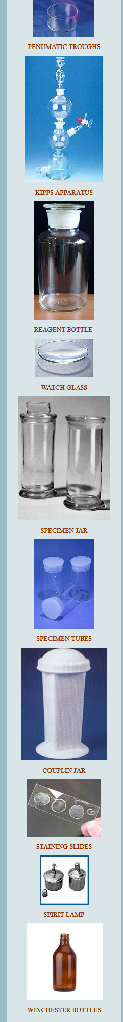 | BGW-23A | Specimen jar(Gas jar) without lid. size: 12.5x3.15 15x5cm 20x5cm 25x5cm 30x5cm 20x7.5cm 25x7.5cm 30x7.5cm 37.5x7.5cm 37.5x10cm 30x15cm 37.5x15cm 20x15cm 30x10cm | RS each 44/- 80/- 85/- 125/- 145/- 240/- 285/- 405/- 660/- 655/- 965/- 1160/- 450/- 585/- | |