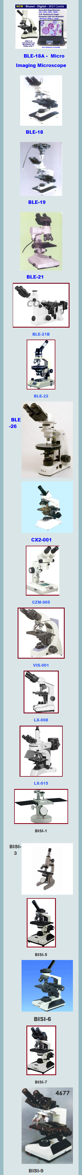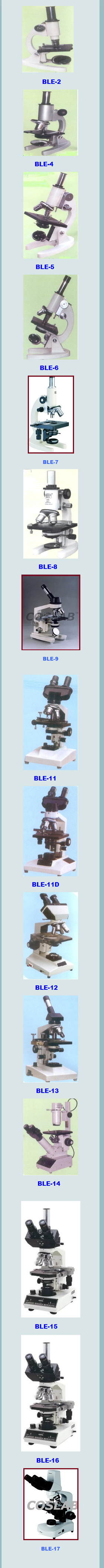 | BLE-8 | Biotech advance & research microscope(Magnification 100x-1500x ) A superior and most advanced microscope for the use in research and pathological laboratories and clinical centres, coarse motion through rack and pinion slow and fine motion through lever system, fixed stage of 120x120 mm fitted with double lense able condensor 1.2 N.A movable through rack and pinion. detachable graduated mechanical stage and plano concave mirror.Complete with achromatic objectives 10x, 45x 100x spring loaded immersion lens and hygenian eye piece 10x and 15x. A- Price with imp. German lenses assembled in India. | 6500/- |
