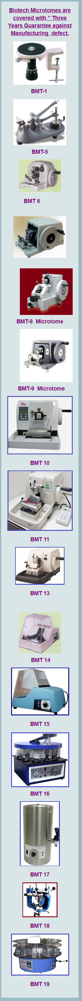 | BMT-13 | Biotech super Rotary microtome Vision 2000 ( Lipshaw type): Latest in the range of microtome high precision, heavy duty microtome, ideal for the research and pathological laboratories. Complete with counter balancing wheel. Automatic feed mechanism and feed release. light aluminium cover hinged at back, protects the internal mechanism. Heavy casted plate fitted with heavy rubber pads for uniform serial sectioning adjustable from 1 to 50 independent of other movement. Supplied complete with one knife, having back and handle in wooden box 6 block holders, honing plate with abrasive powder. Complete | 42500 |